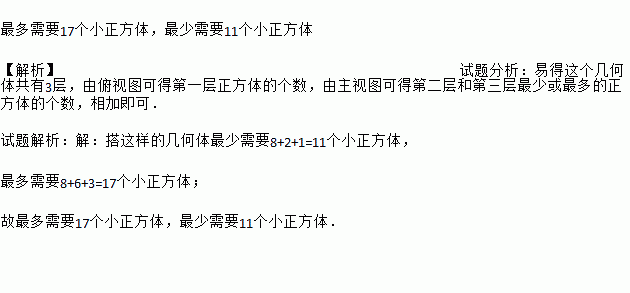 如图是由几个小立方块所搭成几何体从正面和从上面看的形状图:这样搭建的几何体,最少、最多各需要多少个小立方块?