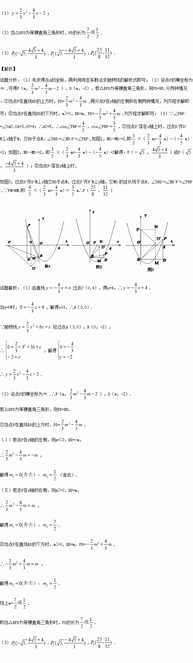 (3)如图2,将△BDP绕点B逆时针旋转,得到△BD′P′,且旋转角∠PBP′=∠OAC,当点P的对应点P′落在坐标轴上时,请直接写出点P的坐标.