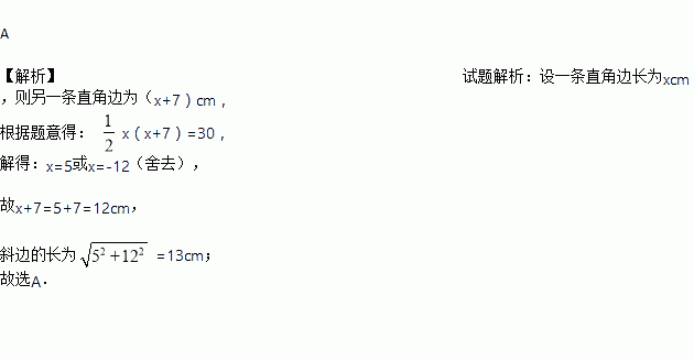 已知直角三角形的面积为30 cm2,两条直角边的差为7cm,则该直角三角形的斜边长为( )