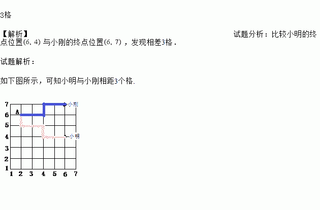 如下图所示,A的位置为(2,6),小明从A出发,经(2,5)→(3,5)→(4,5)→(4,4)→(5,4)→(6,4),小刚也从A出发,经(3,6)→(4,6)→(4,7)→(5,7)→(6,7),则此时两人相距几个格?