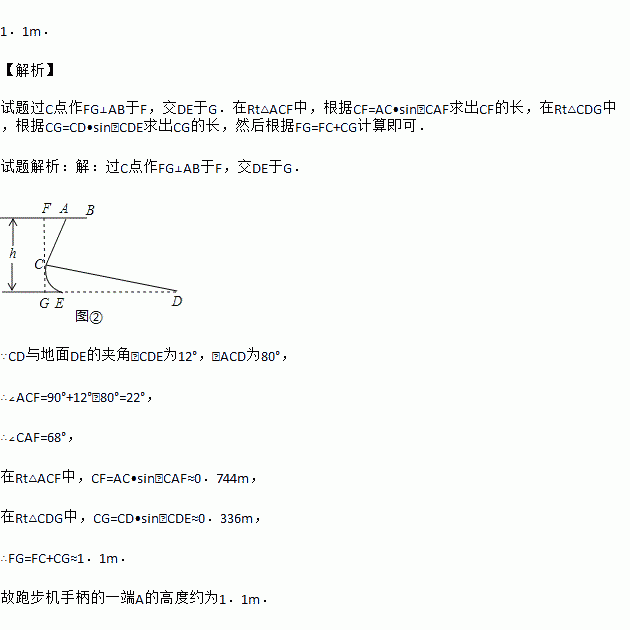 图①、②分别是某种型号跑步机的实物图与示意图.已知踏板CD长为1.6m,CD与地面DE的夹角∠CDE为12°,支架AC长为0.8m,∠ACD为80°,求跑步机手柄的一端A的高度h(精确到0.1m).