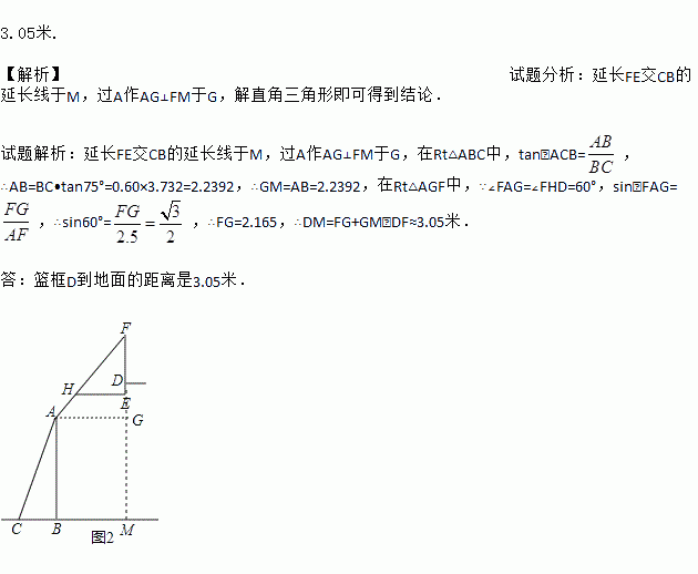 如图1,2分别是某款篮球架的实物图与示意图,已知底座BC=0.60米,底座BC与支架AC所成的角∠ACB=75°,支架AF的长为2.50米米,篮板顶端F点到篮框D的距离FD=1.35米,篮板底部支架HF与支架AF所成的角∠FHE=60°,求篮框D到地面的距离(精确到0.01米).