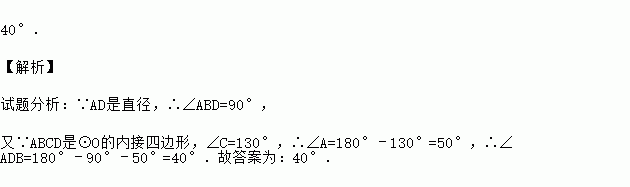 如图,ABCD是⊙O的内接四边形,AD为直径,∠C=130°,则∠ADB的度数为 .