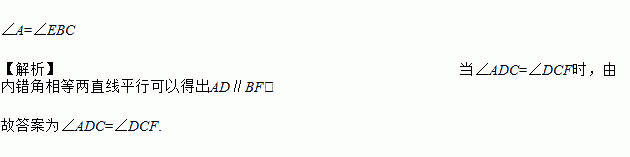 ∠A=∠EBC 【解析】当∠ADC=∠DCF时,由内错角相等两直线平行可以得出AD∥BF; 故答案为∠ADC=∠DCF.