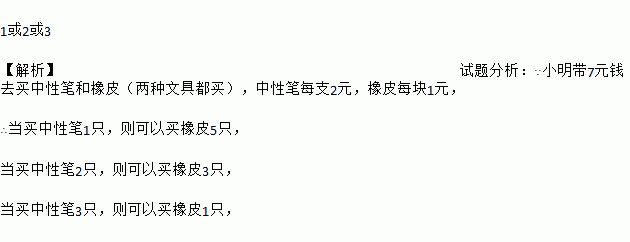 小明带7元钱去买中性笔和橡皮(两种文具都买),中性笔每支2元,橡皮每块1元,那么中性笔能买 支.