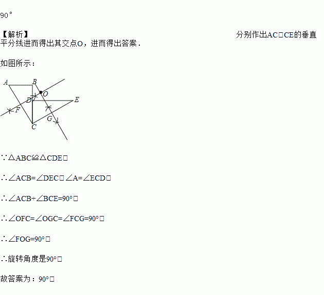 如图,已知:BC与CD重合,∠ABC=∠CDE=90°,△ABC≌△CDE,并且△CDE可由△ABC逆时针旋转而得到.请你利用尺规作出旋转中心O(保留作图痕迹,不写作法),并直接写出旋转角度是_______.