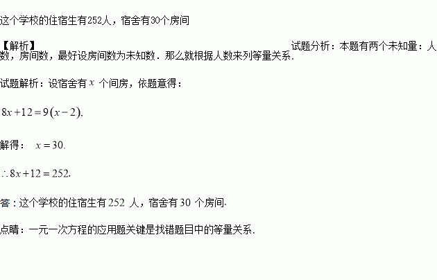 学校安排学生住宿,若每室住8人,则有12人无法安排;若每室住9人,可空出2个房间.这个学校的住宿生有多少人?宿舍有多少房间?