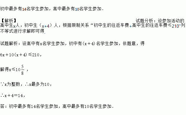 某中学的高中部在A校区,初中部在B校区,学校学生会计划在3月12日植树节当天安排部分学生到郊区公园参加植树活动.已知A校区的每位高中学生往返车费是6元,B校区的每位初中学生往返的车费是10元,要求初、高中均有学生参加,且参加活动的初中学生比参加活动的高中学生多4人,本次活动的往返车费总和不超过210元,求初、高中最多各有多少学生参加.