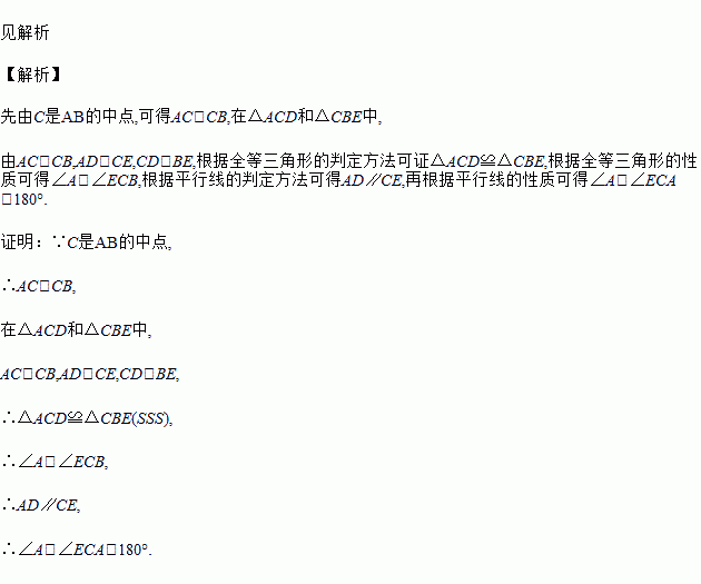 如图,C是AB的中点,AD=CE,CD=BE.求证:∠A+∠ECA=180°.