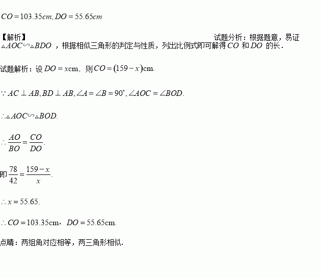 如图,已知AC⊥AB,BD⊥AB,AO=78cm,BO=42cm,CD=159cm,求CO和DO.
