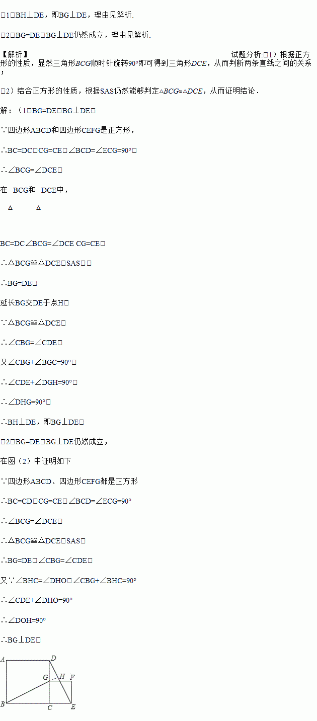(1)BH⊥DE,即BG⊥DE,理由见解析. (2)BG=DE,BG⊥DE仍然成立,理由见解析. 【解析】试题分析:(1)根据正方形的性质,显然三角形BCG顺时针旋转90°即可得到三角形DCE,从而判断两条直线之间的关系; (2)结合正方形的性质,根据SAS仍然能够判定△BCG≌△DCE,从而证明结论. 【解析】 (1)BG=DE,BG⊥DE; ∵四边形ABCD和四...