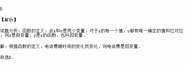 B 【解析】 试题分析:函数的定义:设x和y是两个变量,对于x的每一个值,y都有唯一确定的值和它对应,则x是自变量,y是x的函数,也叫因变量. 【解析】 根据函数的定义,电话费随时间的变化而变化,则电话费是因变量. 故选B.