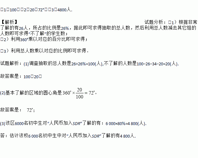 (3)根据抽样的结果,估计该区6 000名初中生对“人民币加入SDR”了解的有多少人(了解是指“非常了解”、“比较了解”和“基本了解”)?