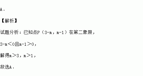 已知点P(3-m,m-1)在第二象限,则m的取值范围在数轴上表示正确的是( )