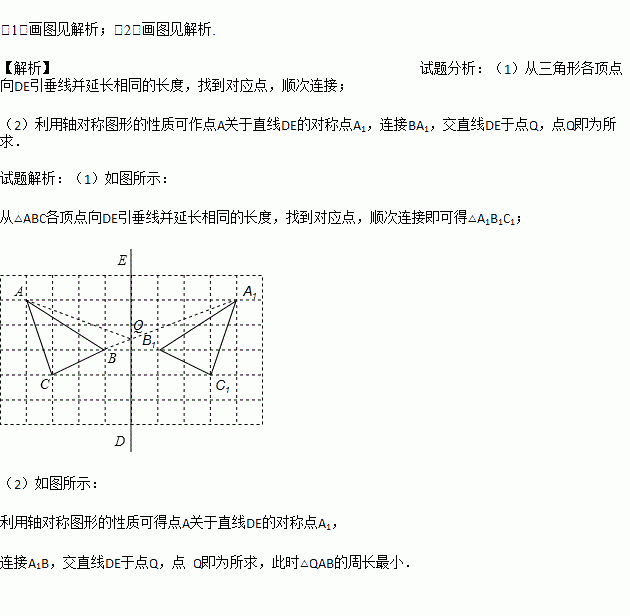 (1)画出格点△ABC(顶点均在格点上)关于直线DE对称的△A1B1C1;