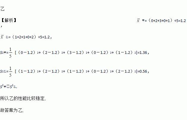 乙 【解析】甲=(0+2+3+0+1)÷5=1.2, 乙=(1+2+1+0+2)÷5=1.2, S2甲= [(0-1.2)2+(2-1.2)2+(3-1.2)2+(0-1.2)2+(1-1.2)2]=1.36, S2乙= [(1-1.2)2+(2-1.2)2+(1-1.2)2+(0-1.2)2+(2-1.2)2]=0.56, S2甲>S2乙. 所以乙的性能比较稳...