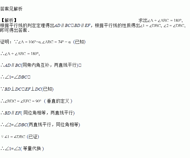 证明: ∵∠A=106°,∠ABC=74°![]()
