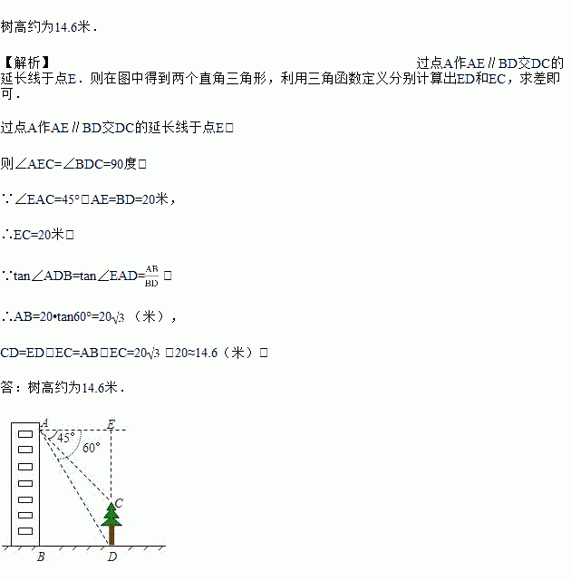 如图,小芸在自家楼房的窗户A处,测量楼前的一棵树CD的高.现测得树顶C处的俯角为45°,树底D处的俯角为60°,楼底到大树的距离BD为20米.请你帮助小芸计算树的高度(精确到0.1米).