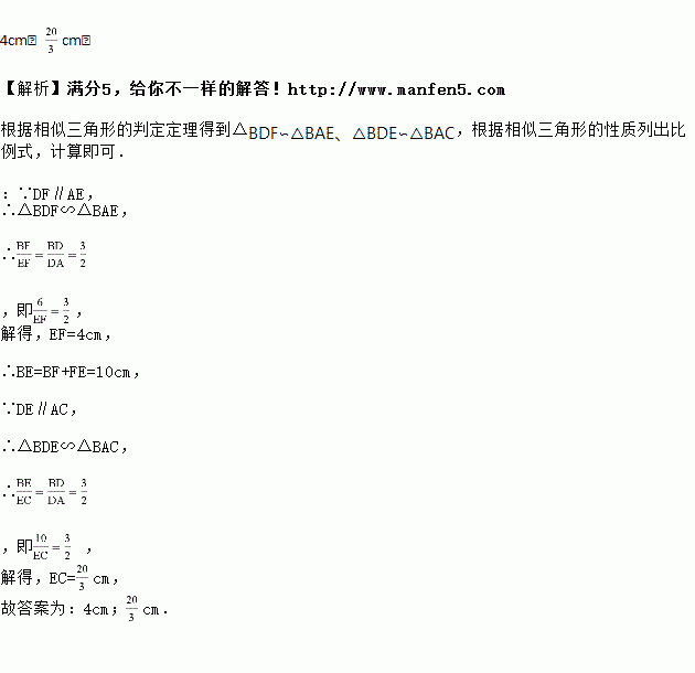 如图,在△ABC中,DE∥AC,DF∥AE,BD:DA=3:2,BF=6cm,则EF=_____,EC=_____.
