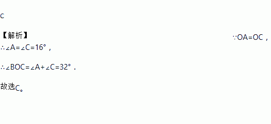 C 【解析】∵OA=OC, ∴∠A=∠C=16°, ∴∠BOC=∠A+∠C=32°. 故选C。
