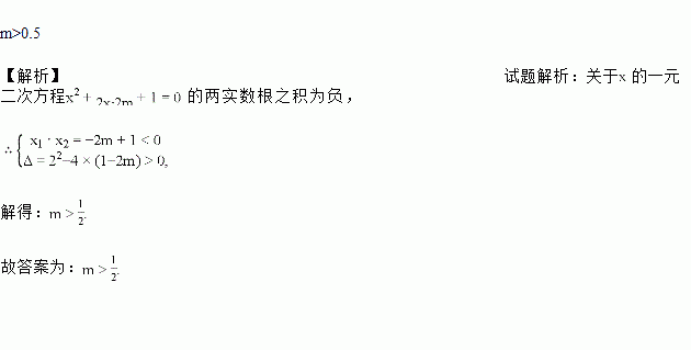 m>0.5 【解析】试题解析:关于的一元二次方程的两实数根之积为负, 解得: 故答案为:
