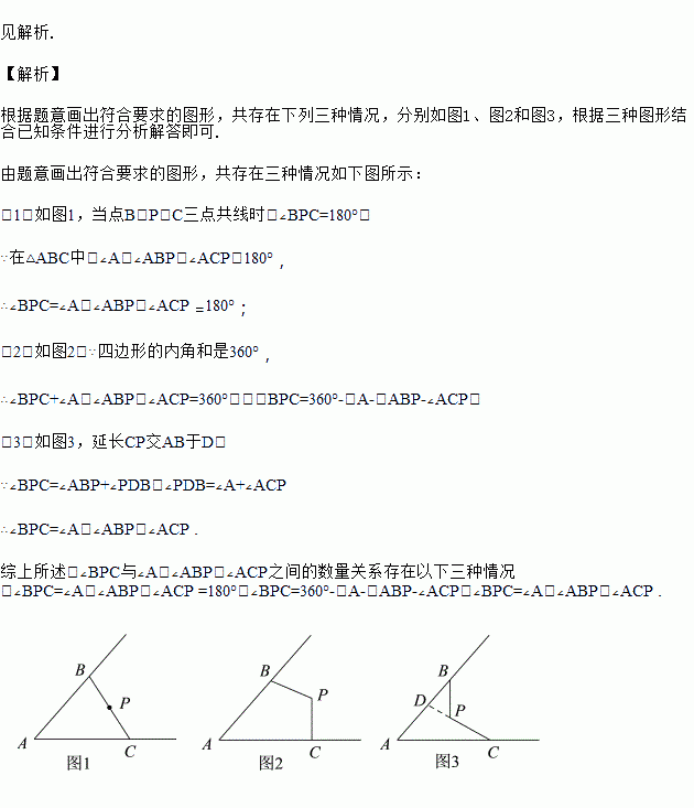 画∠A,在∠A的两边上分别取点B、C,在∠A的内部取一点P,连接PB、PC.探索∠BPC与∠A、∠ABP、∠ACP之间的数量关系,并证明你的结论.