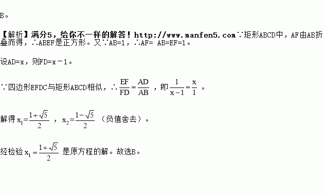 已知矩形ABCD中,AB=1,在BC上取一点E,沿AE将ΔABE向上折叠,使B点落在AD上的F点,若四边形EFDC与矩形ABCD相似,则AD=【 】.
