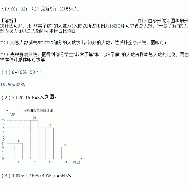 (3)若该校有1000名学生,估计选择“非常了解”、“比较了解”共约有多少人?