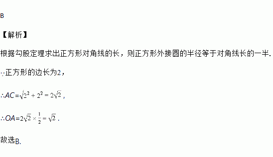 正方形的边长为2,则正方形外接圆的半径是( )