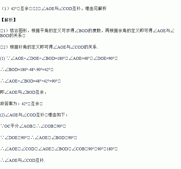 (1)若∠AOE=48°,则∠BOD=______,∠AOE与∠BOD的关系是_______;