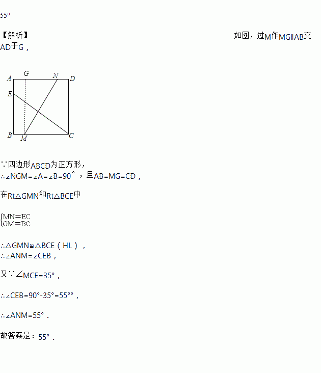 已知:如图,正方形ABCD中,点E、M、N分别在AB、BC、AD边上,CE=MN,∠MCE=35°,∠ANM的度数______.