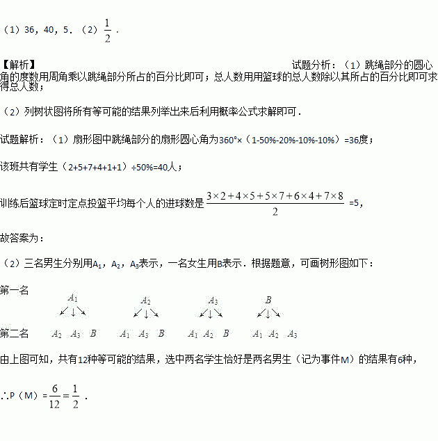 (1)扇形图中跳绳部分的扇形圆心角为 度,该班共有学生 人,训练后篮球定时定点投篮平均每个人的进球数是 .