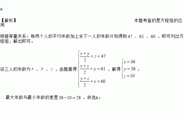 在一家三口人中,每两个人的平均年龄加上余下一人的年龄分别得到,,,那么这三个人中最大年龄与最小年龄的差是( )