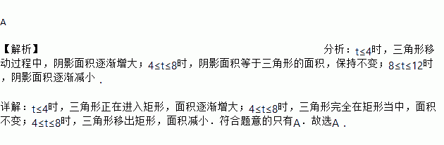 已知,矩形ABCD与Rt△AEF如图(1)放置,AD=EF=3,AB=8,AE=4,现将Rt△AEF沿AB方向以1个单位/秒速度平移,时间为t,那么矩形ABCD与Rt△AEF重叠部分的面积为y,下列能准确反映y与t之间函数关系的图象是( )