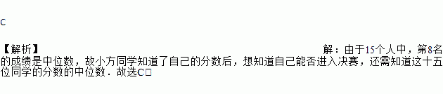 C 【解析】【解析】 由于15个人中,第8名的成绩是中位数,故小方同学知道了自己的分数后,想知道自己能否进入决赛,还需知道这十五位同学的分数的中位数.故选C.