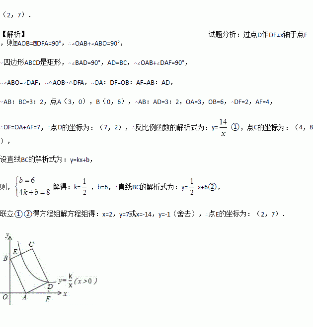 如图,在平面直角坐标系中,矩形ABCD的边AB:BC=3:2,点A(3,0),B(0,6)分别在x轴,y轴上,反比例函数y=(x>0)的图象经过点D,且与边BC交于点E,则点E的坐标为__.