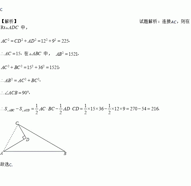 如图所示的一块地,∠ADC=90°,AD=12m,CD=9m,AB=39m,BC=36m,求这块地的面积S为( )cm2.