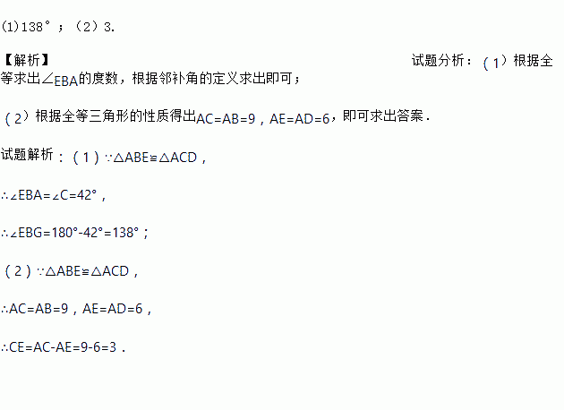 如图,CD⊥AB于点D,BE⊥AC于点E,△ABE≌△ACD,∠C=42°,AB=9,AD=6,G为AB延长线上一点.