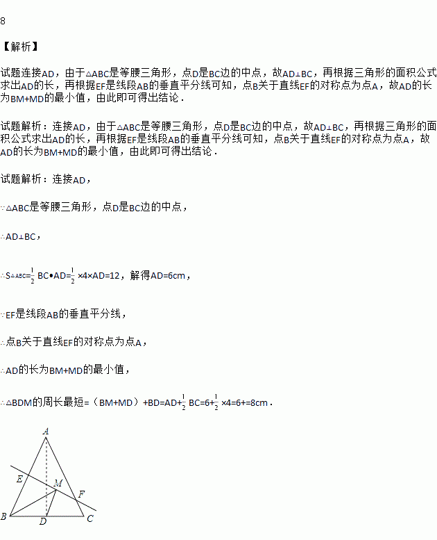 如图,等腰三角形ABC底边BC的长为 4cm,面积是12cm2,腰 AB的垂直平分线EF交AC于点F,若 D为 BC边上的中点,M为线段EF上一动点,则△BDM的周长最短为____cm.