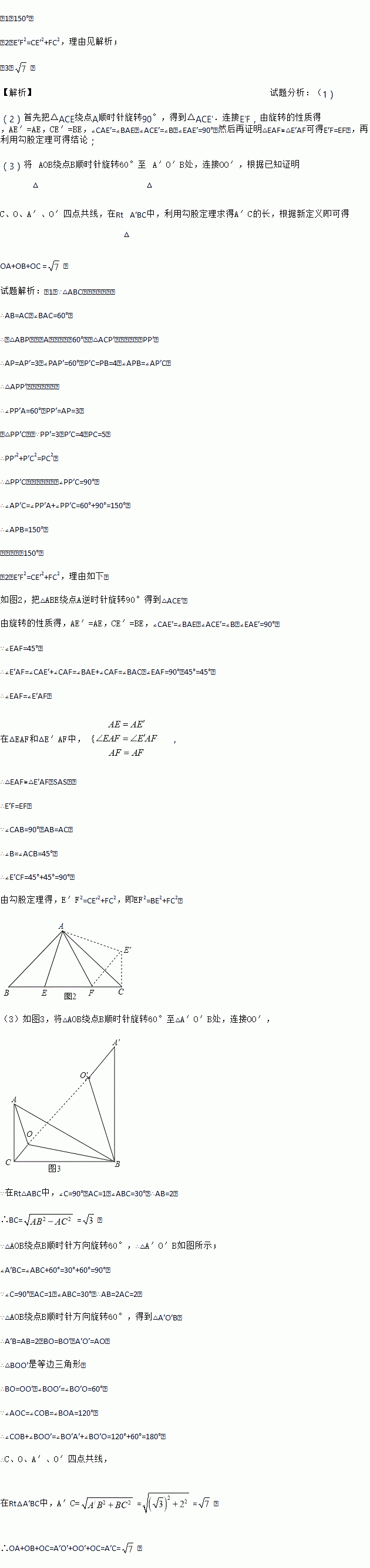 为了解决本题,我们可以将△ABP绕顶点A旋转到△ACP′处,此时△ACP′≌△ABP,这样就可以利用旋转变换,将三条线段PA,PB,PC转化到一个三角形中,从而求出∠APB= ;