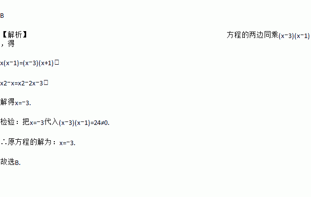 B 【解析】方程的两边同乘(x?3)(x?1),得 x(x?1)=(x?3)(x+1), x2?x=x2?2x?3, 解得x=?3. 检验:把x=?3代入(x?3)(x?1)=24≠0. ∴原方程的解为:x=?3. 故选B.