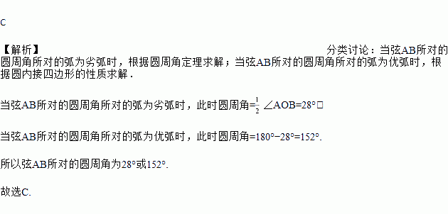 A. 28° B. 112° C. 28°或152° D. 124°或56°