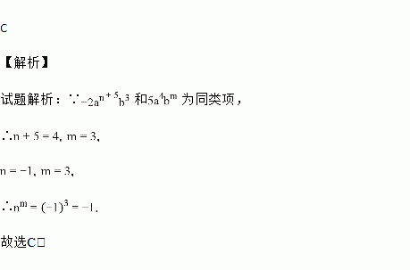 若﹣2an+5b3 和 5a4bm 为同类项,则 nm 的值是( )