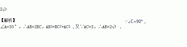 如图 ,在Rt△ABC中,∠C=90°,∠A=30°,AC=3,则斜边AB=______.