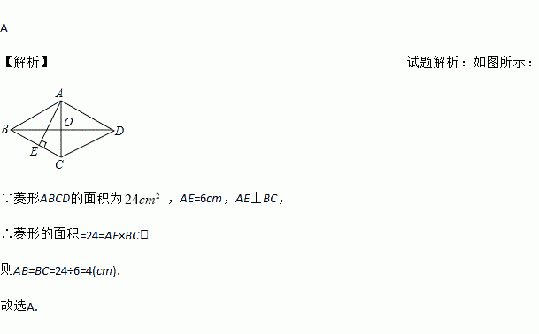 菱形ABCD中,AE⊥BC于E,若S菱形ABCD=24cm2,则AE=6cm,则菱形ABCD的边长为 ( )