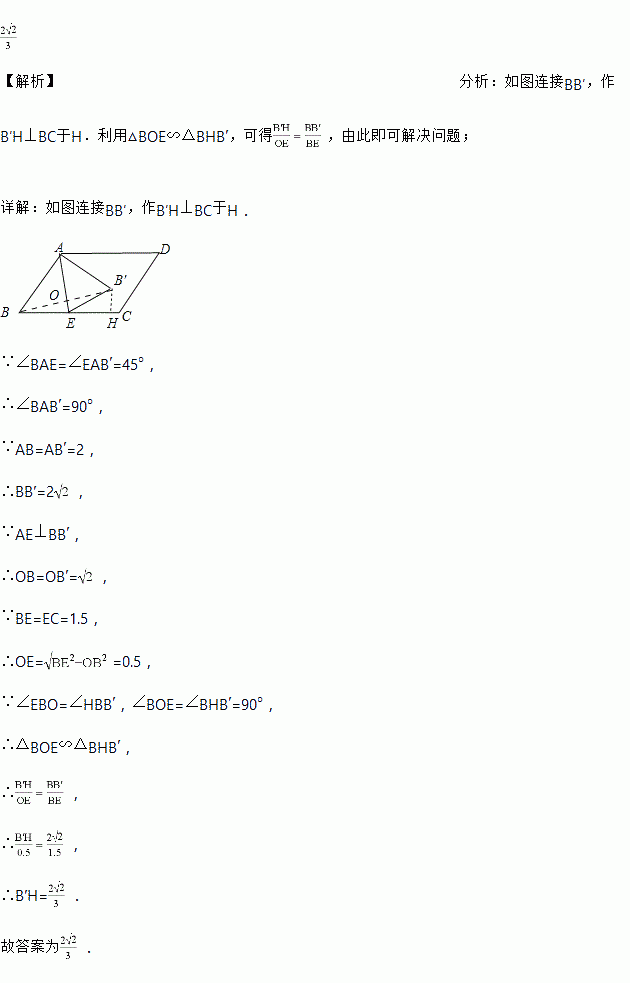 在平行四边形ABCD中,,,点E为BC中点,连结AE,将沿AE折叠到△AB?E的位置,若,则点B?到直线BC的距离为______.