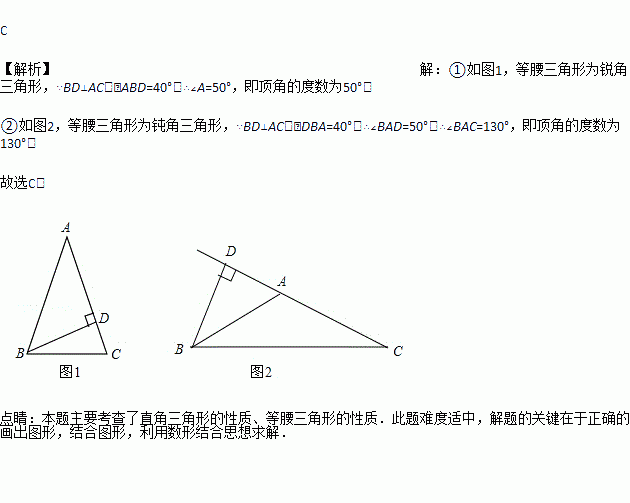 等腰三角形一腰上的高与另一腰的夹角为40°,则其顶角为( )