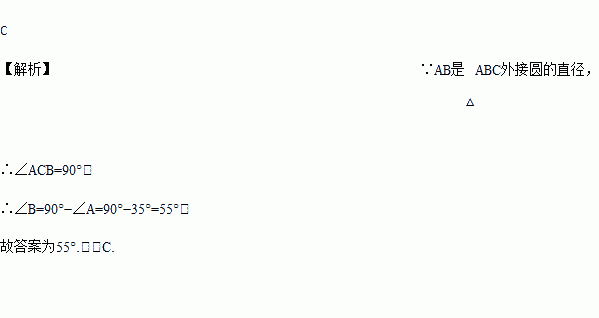 如图,已知AB是△ ABC外接圆的直径,∠ A=35°,则∠ B的度数是( )