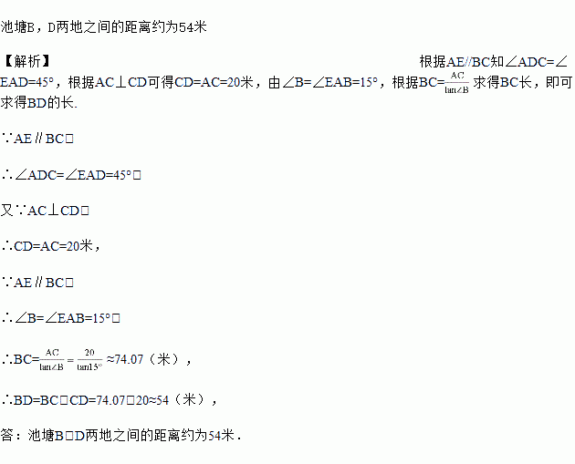 为了测量校园池塘B,D两地之间的距离,从距离地面高度为20米的教学楼A处测得点B的俯角∠EAB=15°,点D的俯角∠EAD为45°,点C在线段BD的延长线上,AC⊥BC,垂足为C,求池塘B,D两地之间的距离(结果保留整数米).(参考数据:sin15°≈0.26,cos15°≈0.97,tan15°≈0.27)