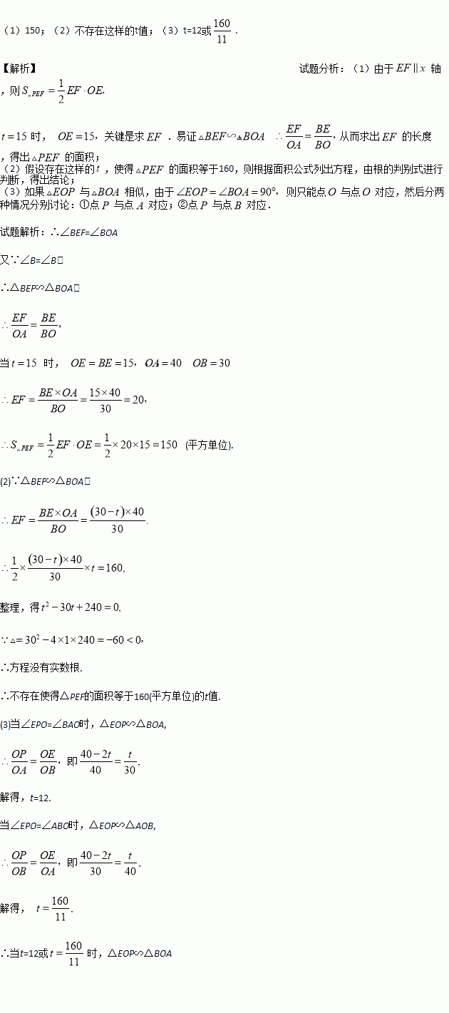 如图,已知A、B两点的坐标分别为(40,0)和(0,30),动点P从点A开始在线段AO上以每秒2个长度单位的速度向原点O运动、动直线EF从x轴开始以每秒1个单位的速度向上平行移动(即EF∥x轴),并且分别与y轴、线段AB交于点E、F,连接EP、FP,设动点P与动直线EF同时出发,运动时间为t秒.